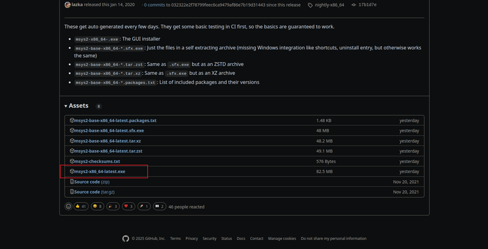 在 Github 上找到下载文件,https://github.com/msys2/msys2-installer/releases/tag/nightly-x86_64