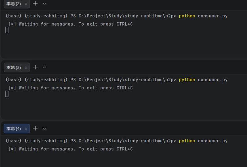 可以在三个终端,开启三个 consumer,这意味着一个 task_queue 被创建,并且三个 consumer 准备消费这个队列。