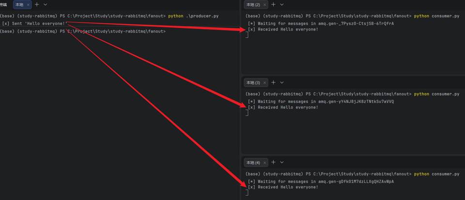 点点对的模式适用于一个消息只被其中一个消费者消费,如果想要所有消费者消费同一个信息,那就需要使用广播(fanout)。