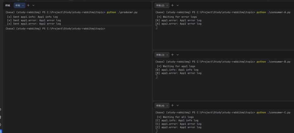 consumer-A,consumer-B,consumer-C 分别消费不同类型的消息,通过 binding_key 的通配符实现和 exchange 绑定。
